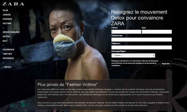 - Acción global en 80 países en los que más de 900 voluntarios se plantaron delante de las tiendas de Zara disfrazados de maniquíes portando pancartas que decían “únete a la moda sin tóxicos”.